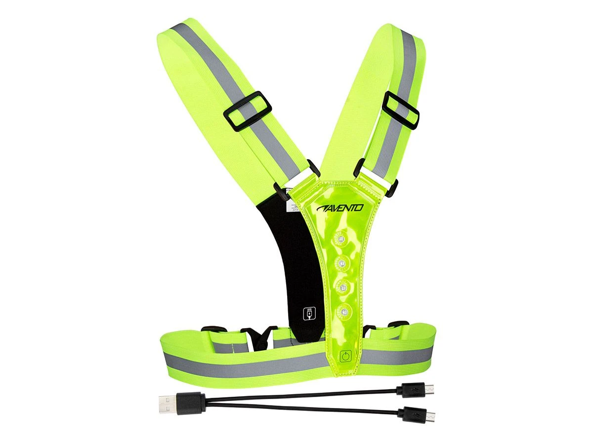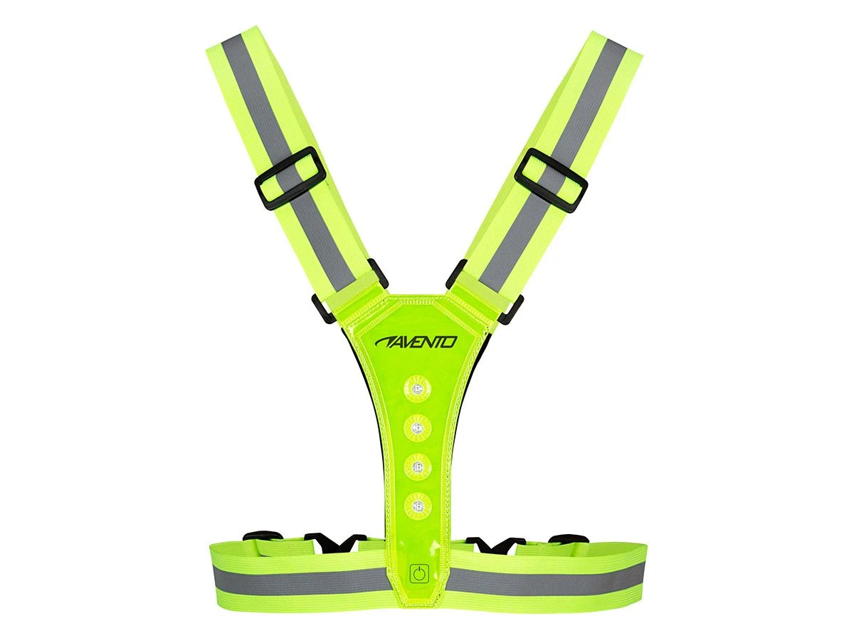 Het vest heeft verstelbare elastische polyester banden met 3M Scotchliteâ„¢ reflectie. De kunststof panelen aan de voor- en achterkant zijn neopreen gevoerd. Het voorpaneel is voorzien van 4 witte LED lampjes (61 lumen) en het achterpaneel van 4 rode LED lampjes (21 lumen). De lampjes kunnen knipperen en continu branden.