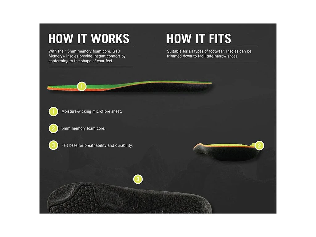 De Coolmax® DermoDry toplaag zorgt ervoor dat het transpiratievocht wordt afgevoerd en de 5mm dikke laag memoryfoam zorgt voor comfort. Ook heeft de memoryfoam tussenlaag een open-cell constructie, waardoor deze ademend en ventilerend is. De basis van de zool is gemaakt van vilt, dat zorgt voor de steun aan je voeten.