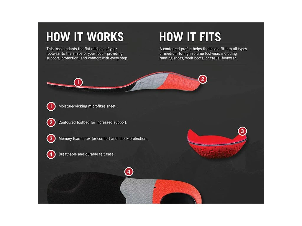 De inlegzolen hebben een hoog ademend vermogen en goede vochtregulatie. De Coolmax® DermoDry toplaag zorgt ervoor dat het transpiratievocht wordt afgevoerd en de memory foam latexlaag zorgt voor het comfort en een goede schokdemping. Het speciaal gecontourde profiel zorgt voor veel steun en stabiliteit aan je voeten.