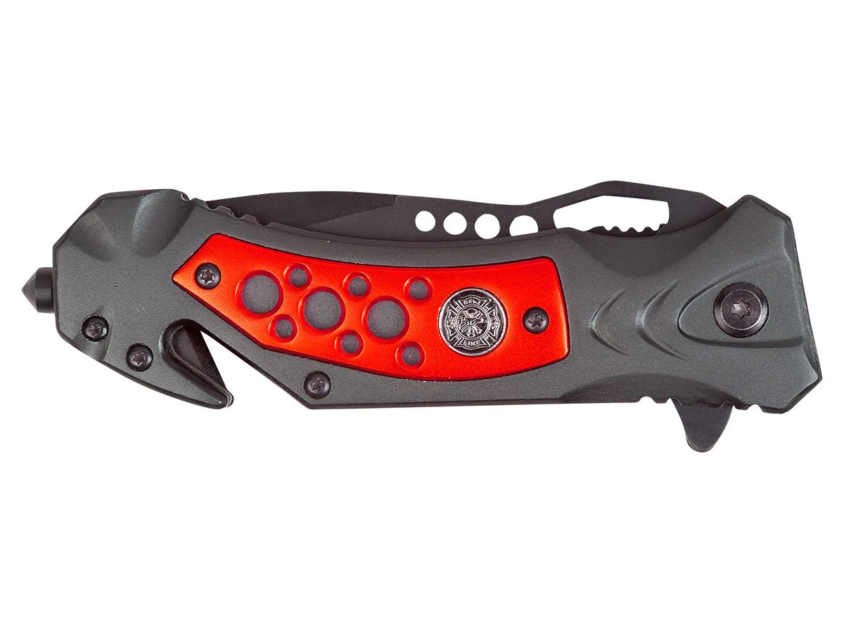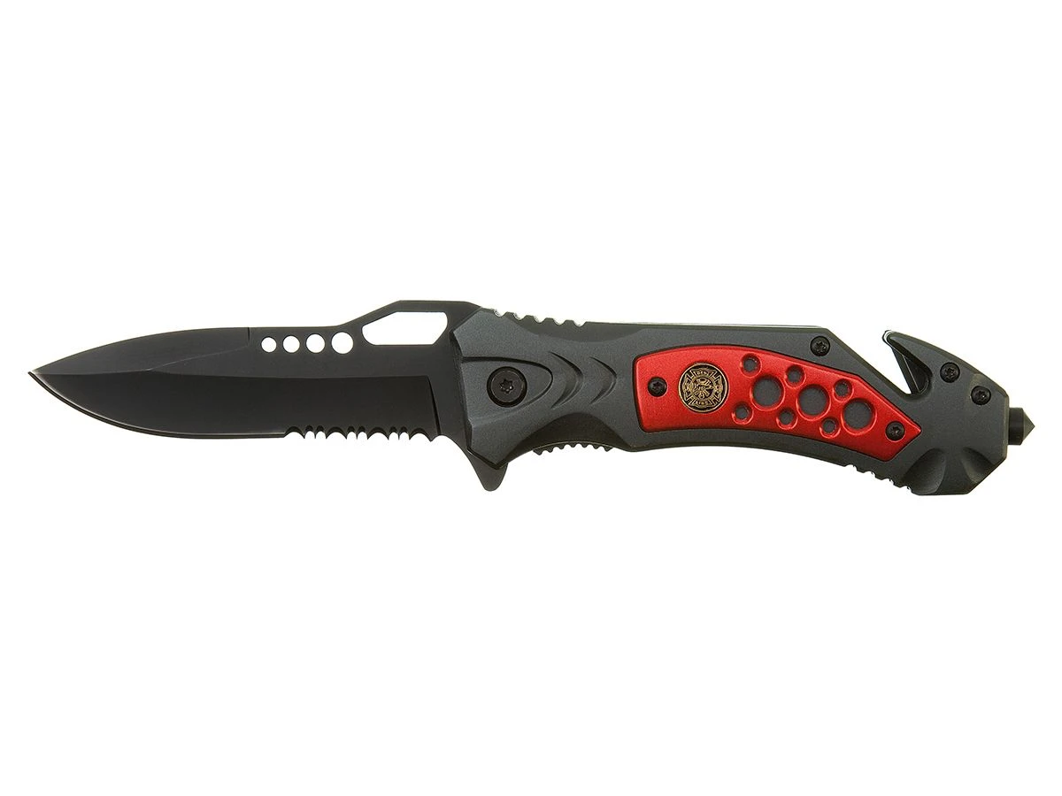 Je kunt het mes met 1 hand te openen en het lemmet wordt door een linerlock vergrendeld. Het lemmet is gemaakt van zwart gecoat roestvrij staal en heeft een vlijmscherp gekarteld gedeelte. Het handvat is voorzien van een bekleding van geanodiseerd aluminium met rode inzetstukken. Het handvat is ook nog voorzien van extra ribbels voor extra grip.
