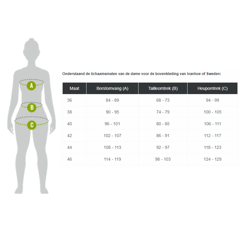 De Ivanhoe vest Bella FZ voor dames wordt geleverd in de maten 36 – 38 – 40 – 42 – 44 – 46.