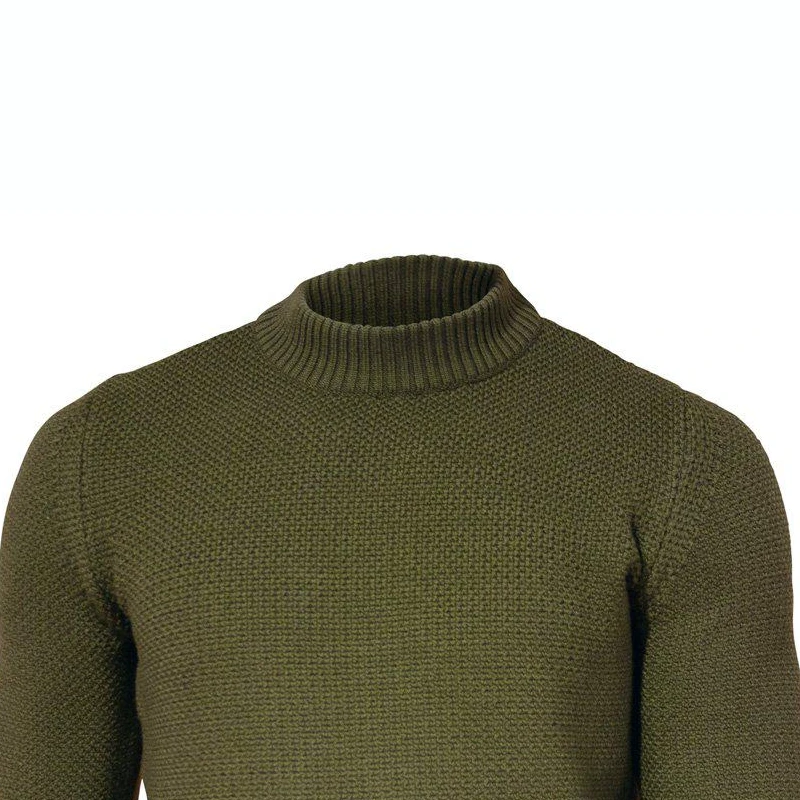 De trui is voorzien van een ronde hals met een gebreide structuur 7 gauge in de trui maakt dit een stoere trui voor een man. Het label van Ivanhoe op de linker arm van de trui zijn van Jacron een vegan leder alternatief. Zowel de manchetten van de armen als de onderzijde van de trui zijn in een rib gebreid.