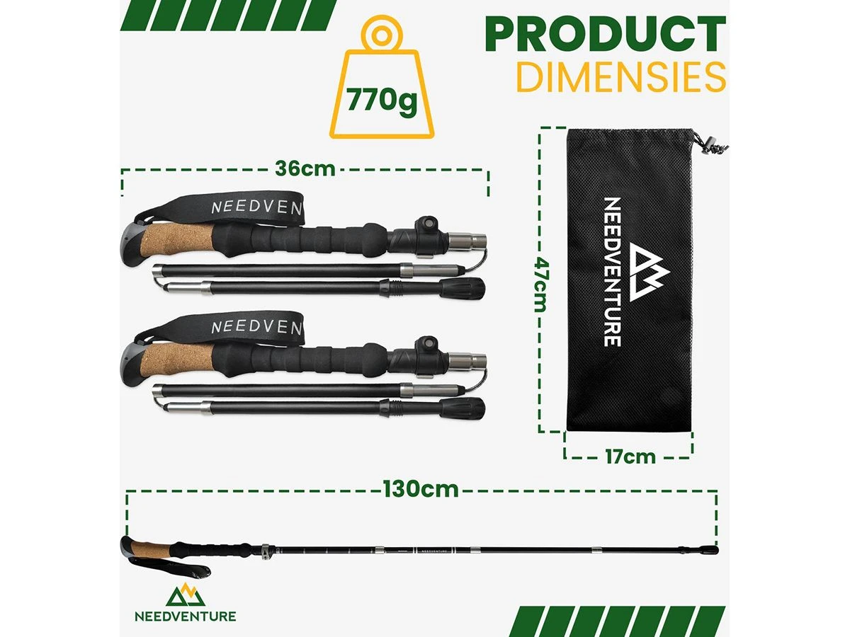 Met de wandelstokken van Needventure hoef je geen zware last mee te dragen tijdens je avontuurlijke wandelingen. Door het lichte gewicht zijn ze gemakkelijk mee te nemen en voelen ze niet als een last aan je armen. Door het compacte formaat nemen de opgevouwde nordic walking stokken weinig ruimte in.