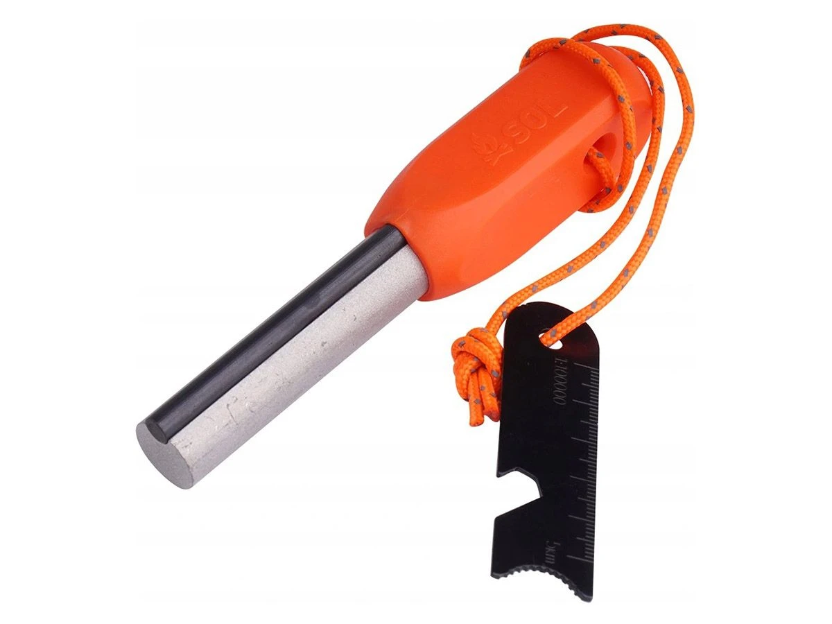 De kern van het meegeleverde koord is gemaakt van waterbestendige katoenen tondel, dit vezelrijke materiaal is met een vlam of vonk eenvoudig te ontsteken. De bijgevoegde schraper dient tevens als flessenopener en is gegraveerd met een liniaal.