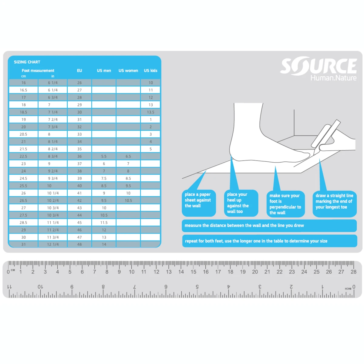 Zie ook de bijlage voor de maattabel van Source sandalen.