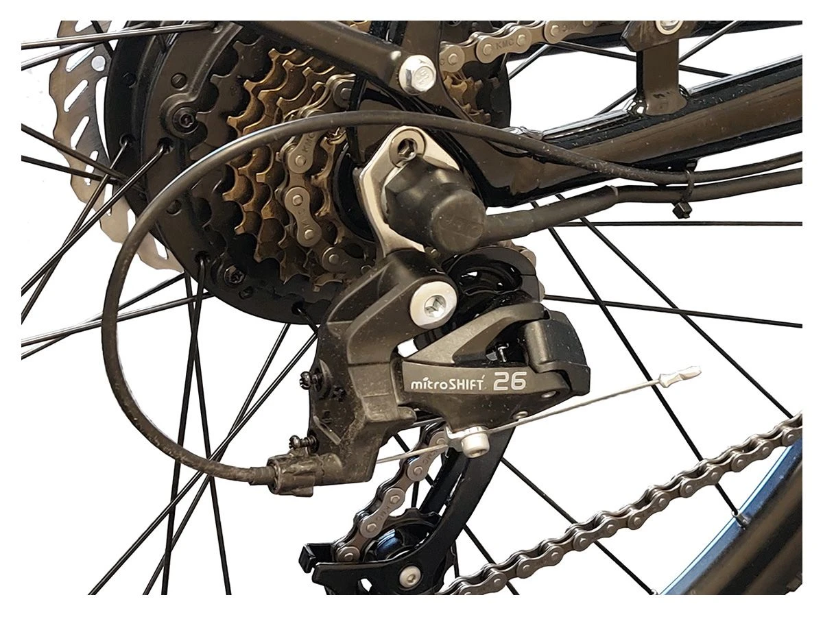 De 13 Ah accu is keurig opgenomen in het solide aluminium frame en omdat de Bafang achterwielmotor door de cassette met 7 tandwielen voor een groot deel aan het oog wordt onttrokken is het niet direct duidelijk dat deze fraaie fiets voorzien is van elektrische trapondersteuning. Totdat u andere weggebruikers fluitend voorbijfietst, natuurlijk.