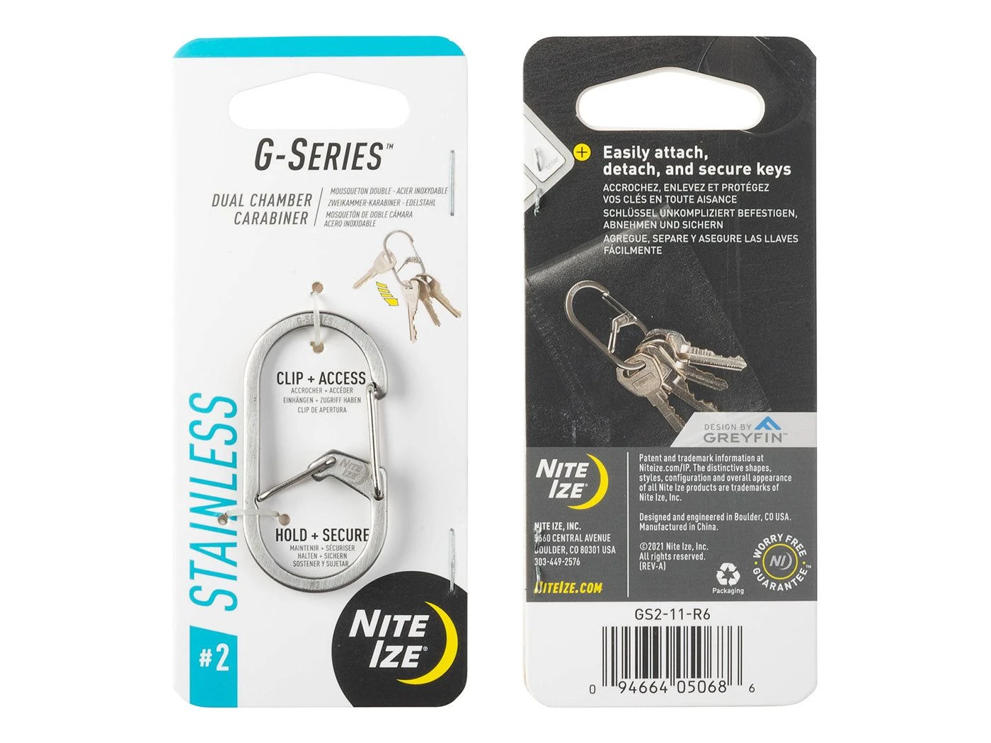 De Nite Ize G-Series zijn roestvrijstalen G-vormige karabijnhaken met een dubbele clip, ideaal om bijvoorbeeld sleutels aan te bevestigen.