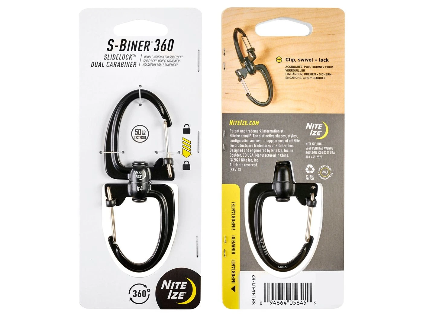 Verkrijgbaar in verschillende formaten. Kleine S-Biners zijn geschikt voor bijvoorbeeld het vergrendelen van rugzakken en koffers door de twee ritsen aan elkaar te verbinden. Grotere S-Biners Zijn ideal om bijvoorbeeld een lantaarn op te hangen. De S-Biner 360 is voorzien van twee plastic sliders om de haken te vergrendelen. Het product is gemaakt van RVS en heeft maximum draaggewicht van 22.7 kg.