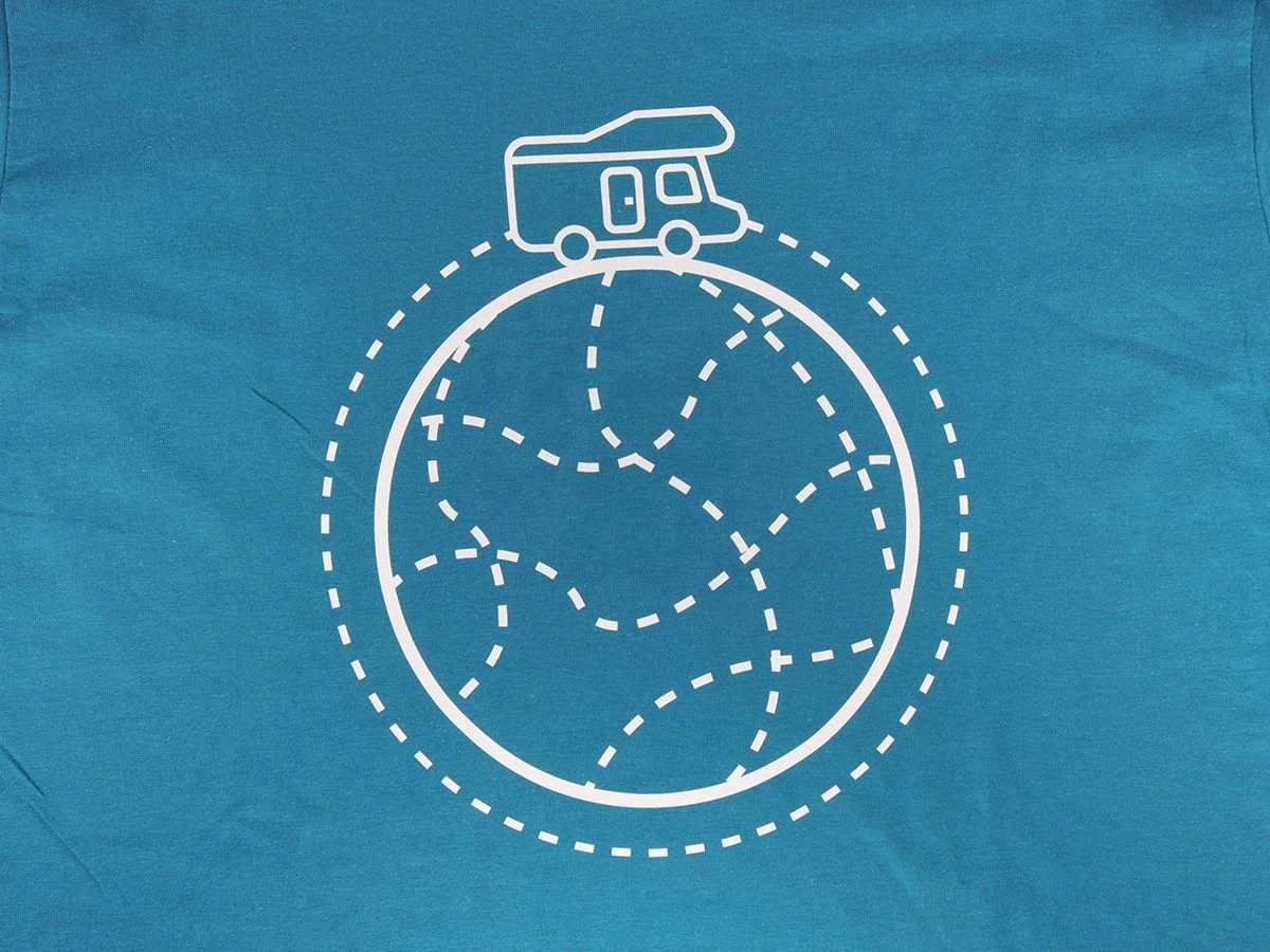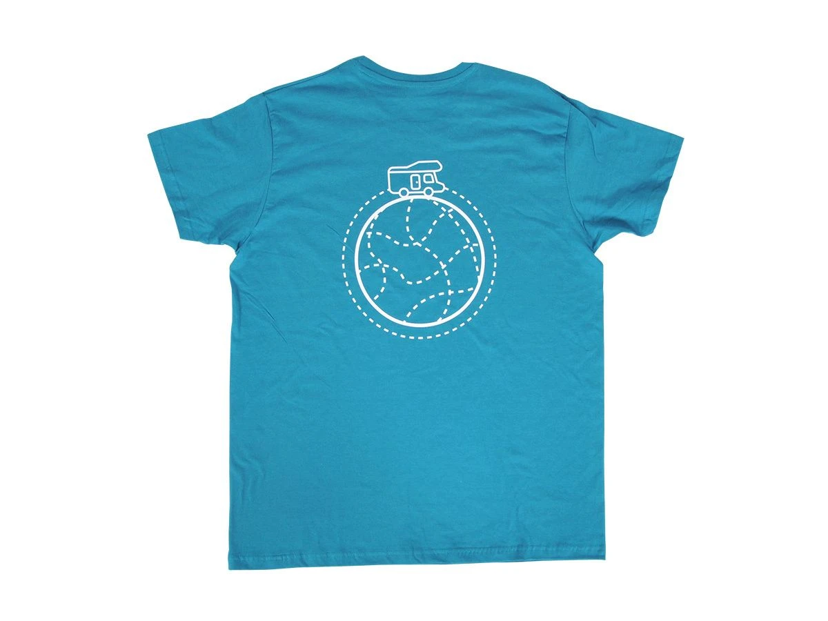 Het shirt is gemaakt van polyester en is geschikt voor zowel dames als heren. Het T-shirt heeft op de linkerborst een print met een wereldbol met daarop een camper, dezelfde print is ook op de achterkant te vinden!