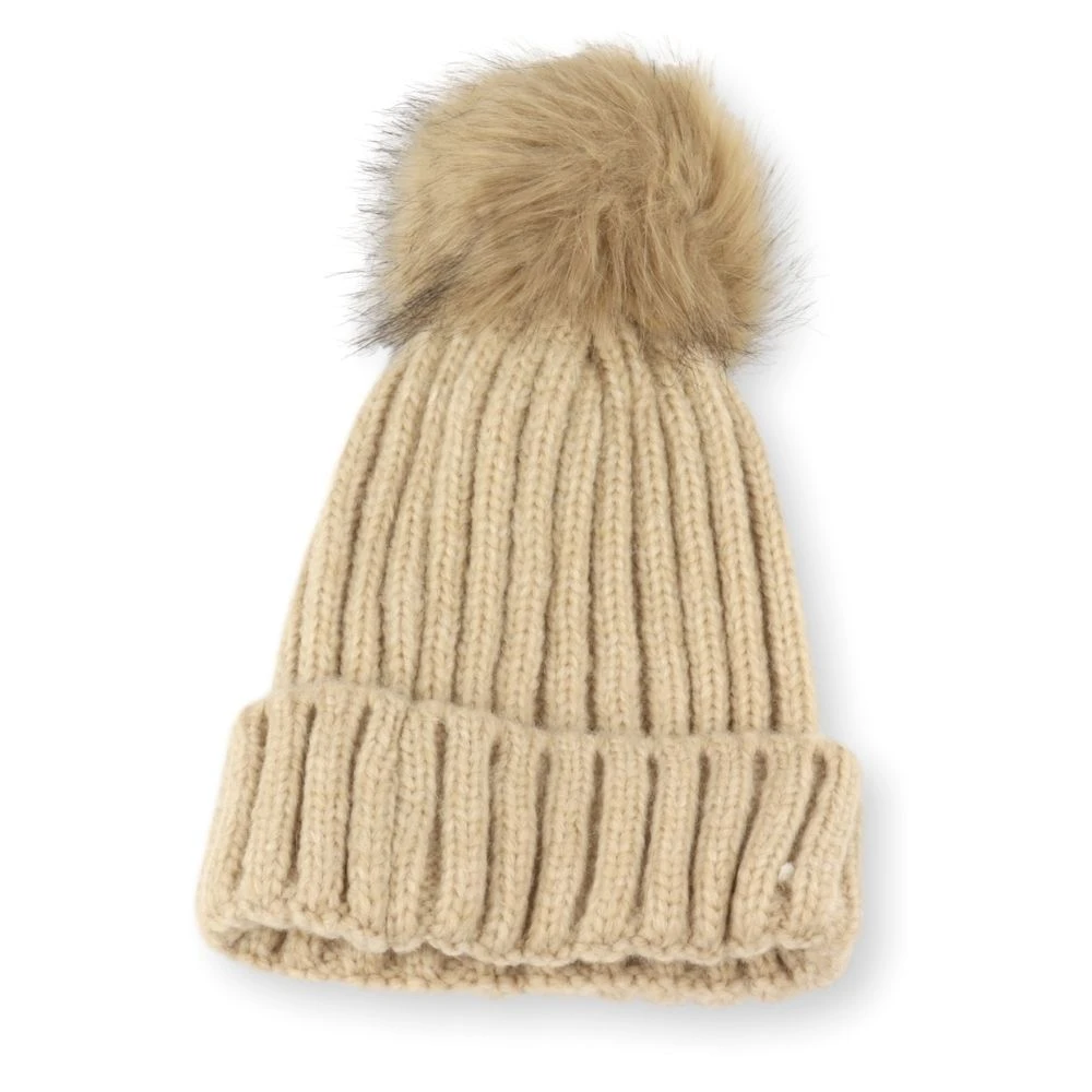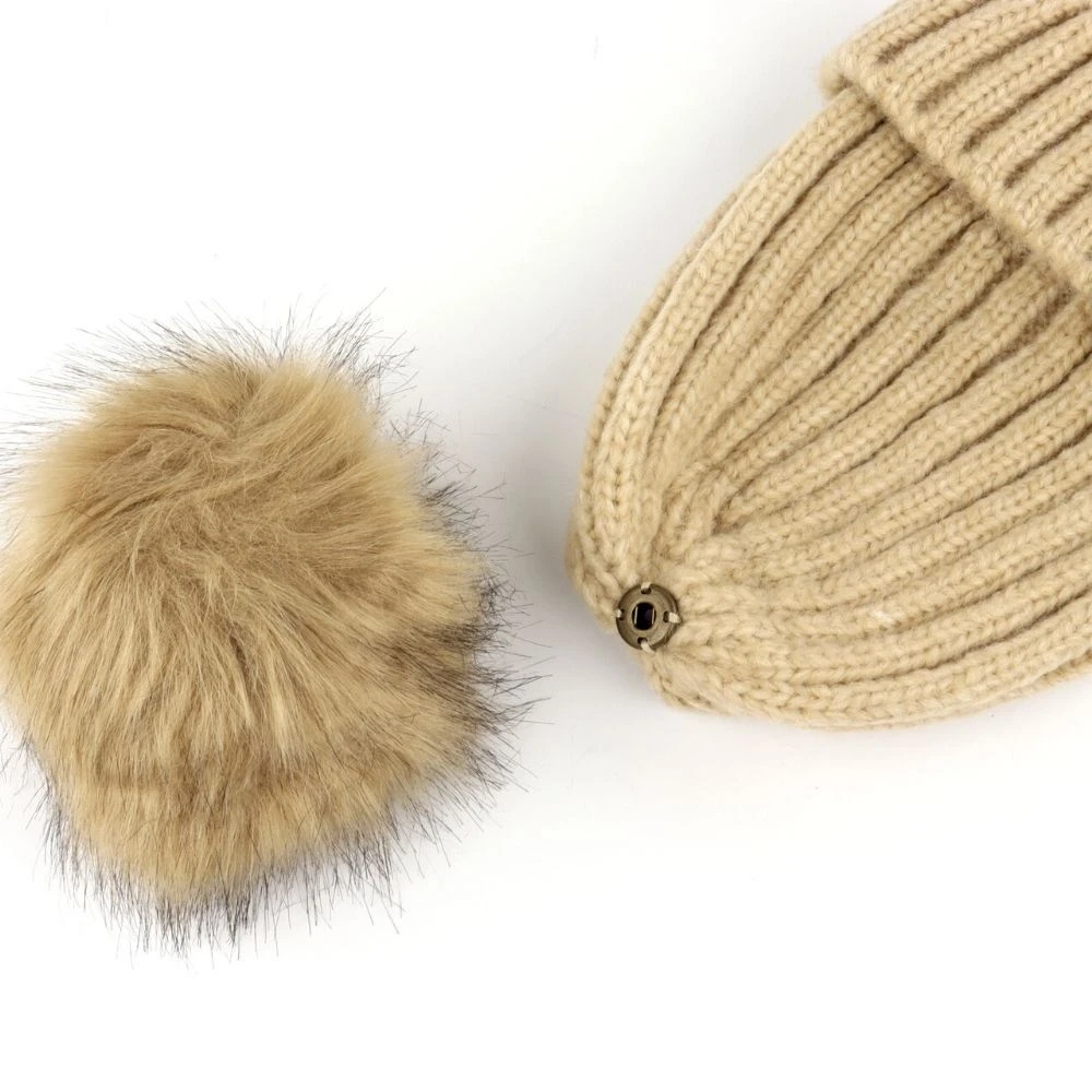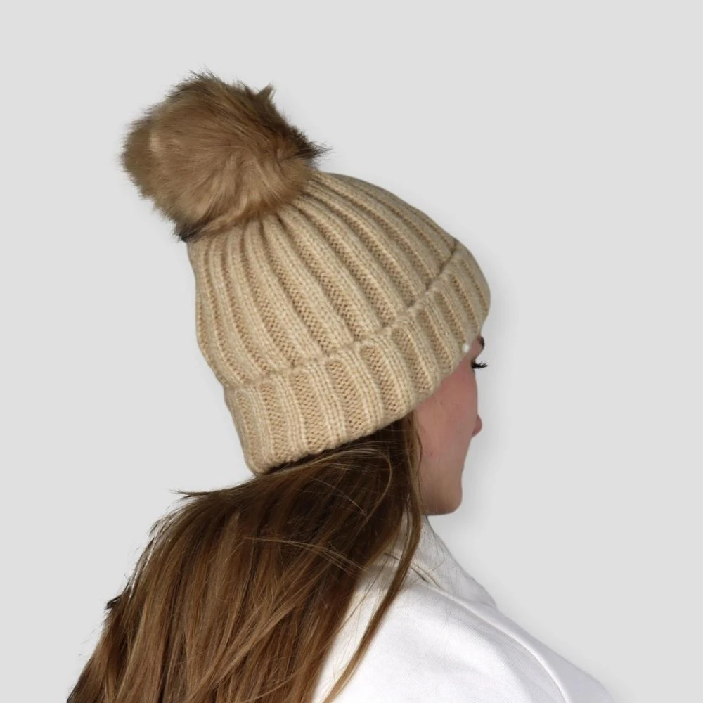 De muts heeft een beige kleur. Op de muts zit een decoratieve pompon. Deze pompon is ook te verwijderen.