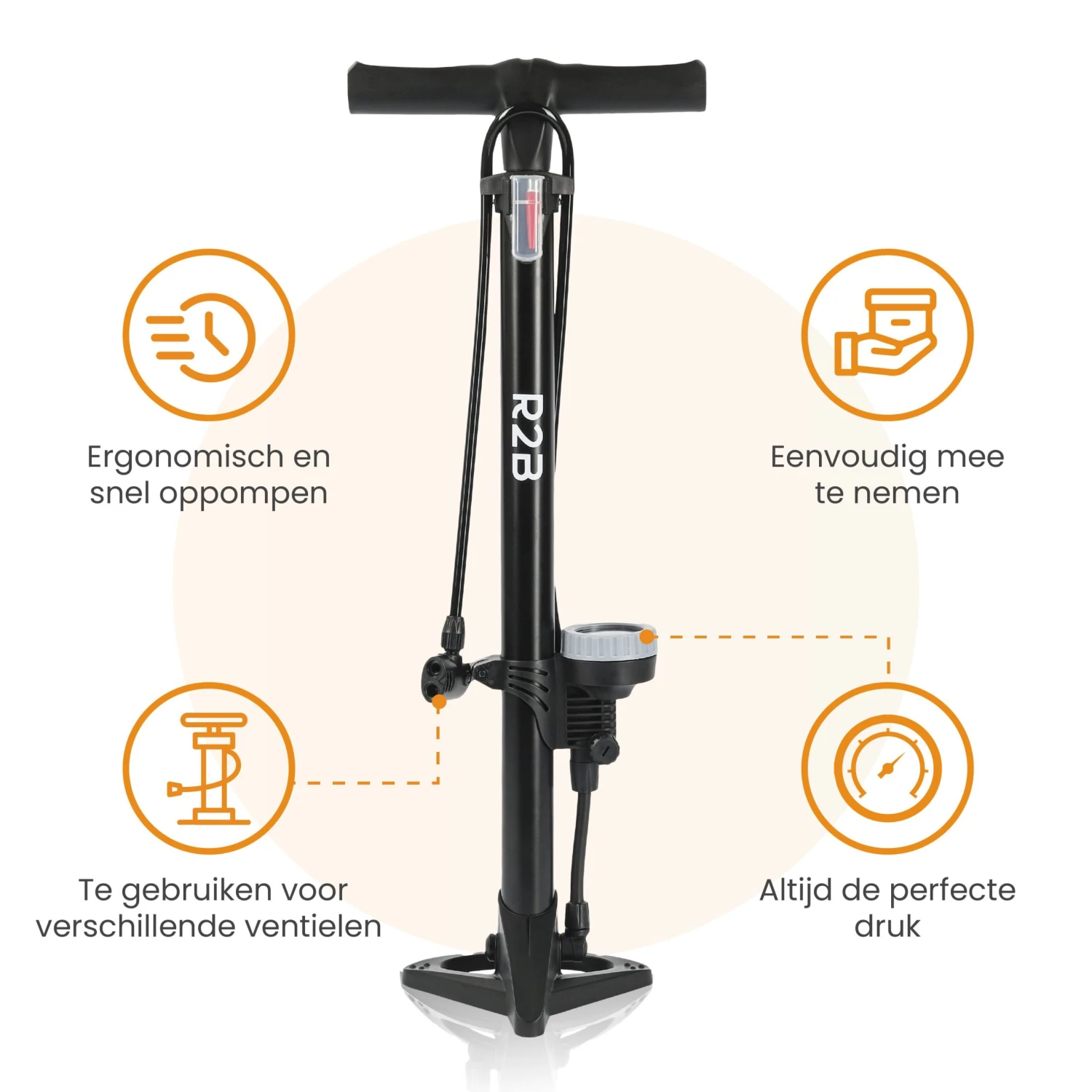 Wil jij ook moeiteloos en efficiënt elk type band oppompen? Voeg nu deze Fietspomp toe aan je winkelwagen en ervaar de topkwaliteit van R2B, dé expert in fietsaccessoires en meer!