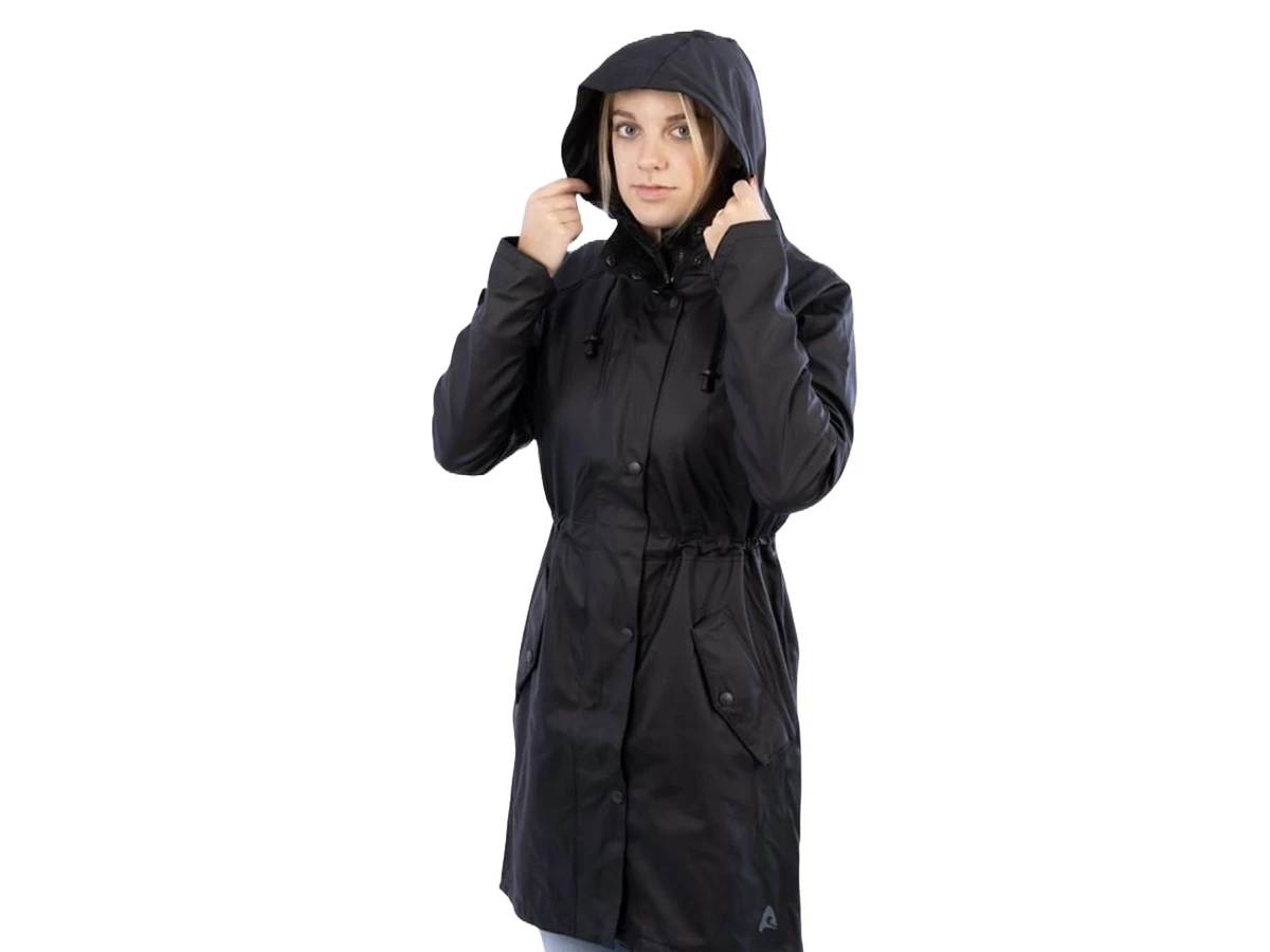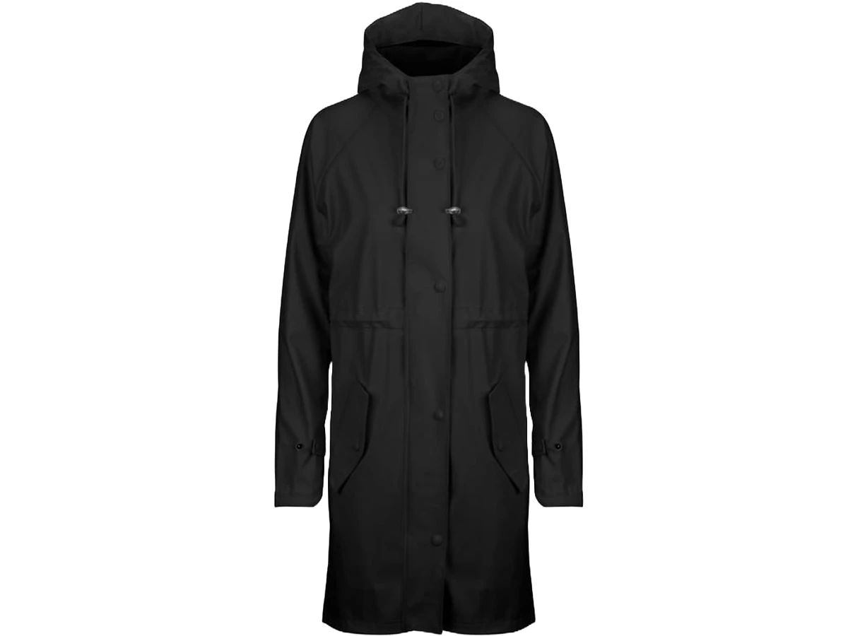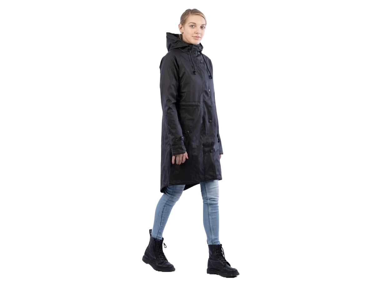 De regenmantel is voorzien van een rits en zakken met regenoverslagen. De jas is vervaardigd met gebruik van gelaste naden en een matte PU coating.