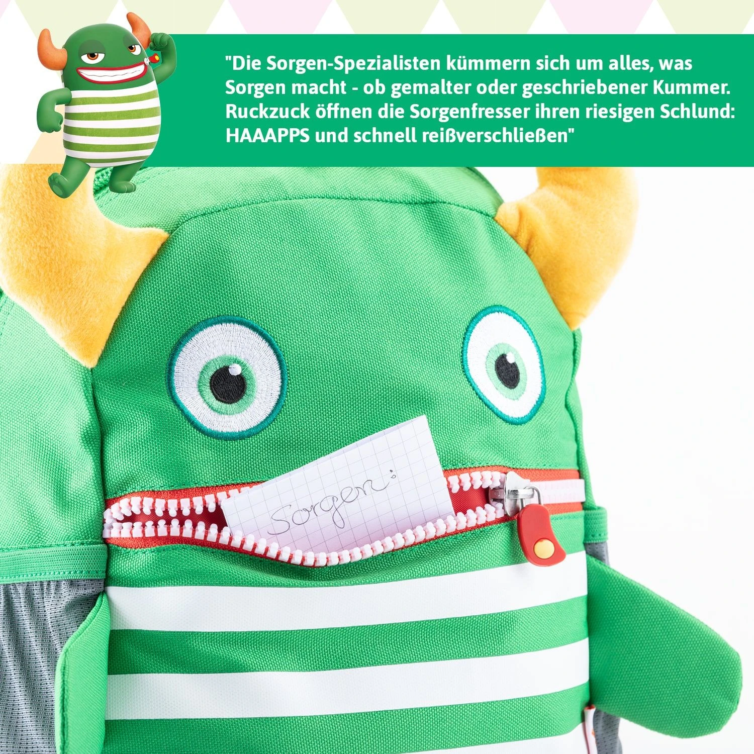 Vooraan heeft elke rugzak een zak met ritssluiting als mond die geschreven of getekende zorgen kan “opeten”. Rits hem open, stop er een briefje in en poef, de kinderen zijn van hun zorgen af!