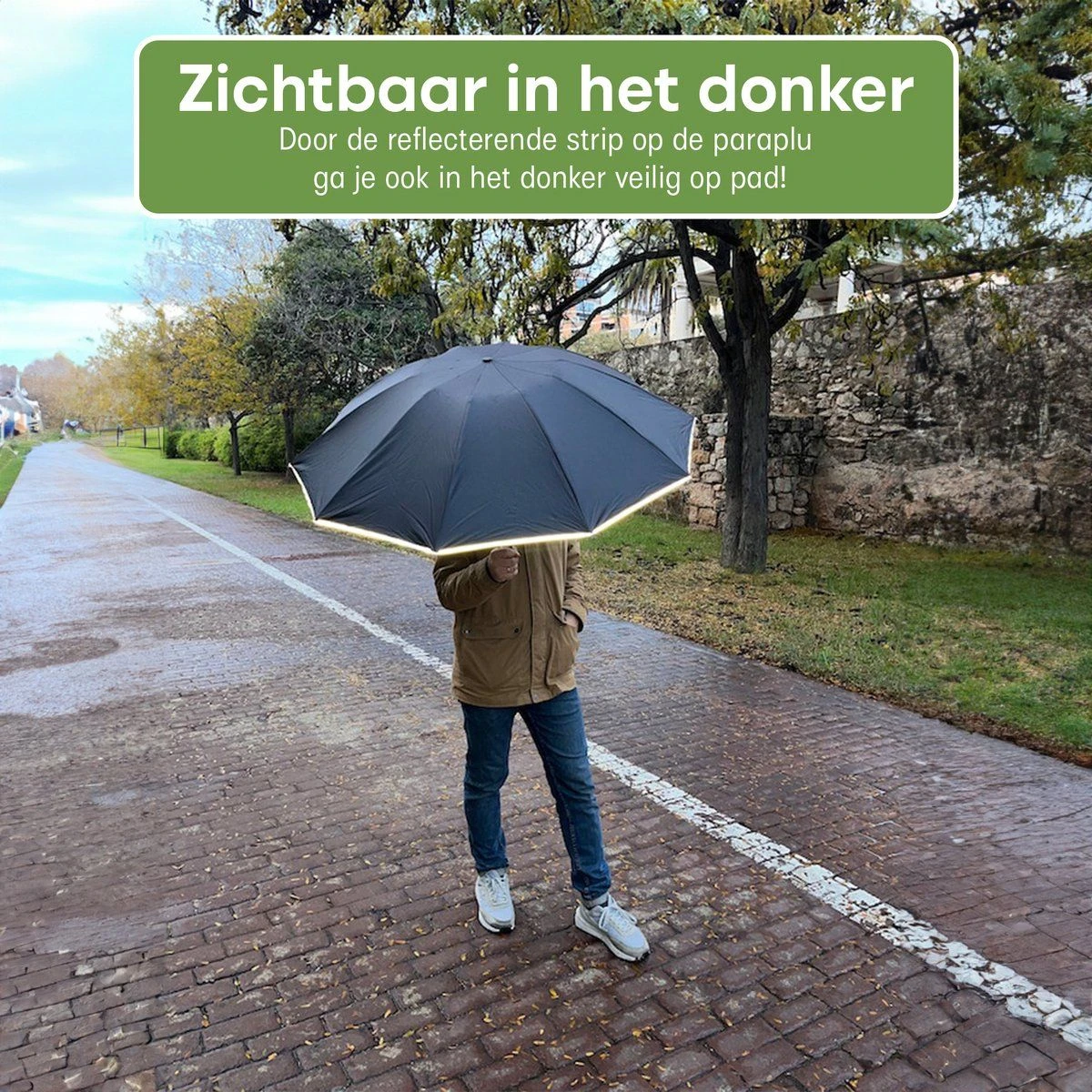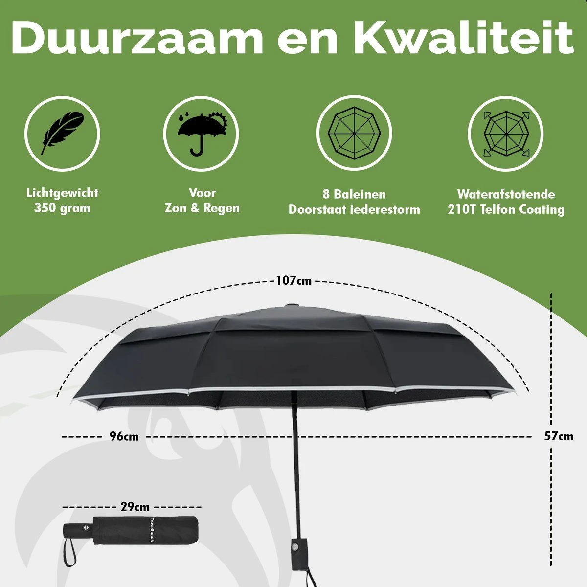 Door de versterkte glasvezelribben is onze stormparaplu is speciaal ontworpen om windstoten van tot wel 100km/h te weerstaan. Hierdoor voorkom je dat de paraplu naar buiten vouwt en zul je altijd een droog dak boven je hoofd hebben.
