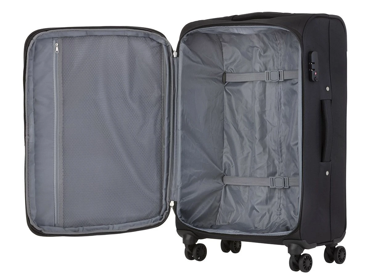 De voering is voorzien van een devider om uw reisbagage georganiseerd bij elkaar te houden. Naast een groot ritsvak, zijn er ook twee voorvakken voor makkelijke toegang tot een boekje of paspoort. De voorvakken zijn eventueel extra af te sluiten met een hangslotje. De midden- en grote maat op de koffer is voorzien van een “Expander”. Dit betekent dat de koffer ongeveer 15% extra capaciteit heeft, op het moment dat deze vol zit. De rits zet dan iets verder uit, waardoor al je vakantie-aankopen makkelijk mee terugkunnen!
