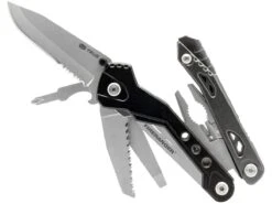 Het deels gekartelde mes is met de hand te openen en alle tools zijn, todat ze nodig zijn, strak weggewerkt. Ideaal dus voor kamperen en outdoor en wordt geleverd met een nylon sheath.